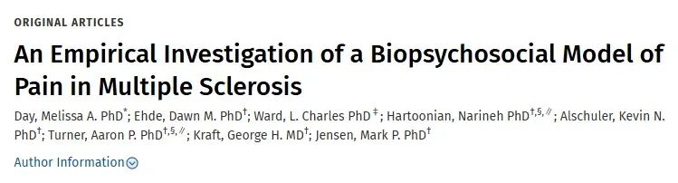 [5] Day MA, Ehde DM, Ward LC, et al. An Empirical Investigation of a Biopsychosocial Model of Pain in Multiple Sclerosis[J]. Clin J Pain. 2016 Feb;32(2):155-63. Doi: 10.1097/AJP.0000000000000240.