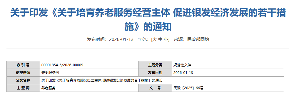1月13日,民政部等八部门联合印发相关措施,从品牌建设、供需对接、科技赋能等五方面推出14项举措。明确优化居家照护、陪诊助医等服务供给,推动数智技术在老年健康监测等场景应用,完善标准认证与权益保障机制,通过要素扶持与环境优化,满足老年人多层次健康养老需求。(来源:民政部)